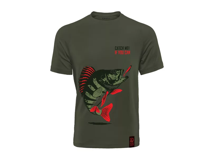Majica Catch me! Ostriž je temno zelene barve, na njej je narisan ostriž, ki se ravno približuje vabi, kar je želja vsakega ribiča.