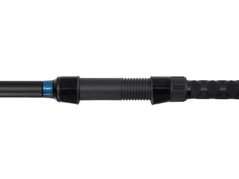 Blank ima masivne, dvojne obročke s SiC vložki, ki so odporni na mehanske poškodbe in lepo vodijo vrvico. Nosilec za rolo omogoča uporabo tudi največjih rol in jih varno drži na mestu. Ročaj je v celoti prekrit s skrčljivim materialom, ki odlično dopolnjuje celoten dizajn palice. Za boljši oprijem med metanjem smo na koncu palice namestili stožčasti del iz črno-sive EVA pene s kamuflažnim vzorcem. Druga oblikovna značilnost so na primer modri navoji in 3K vzorec nad ročajem.