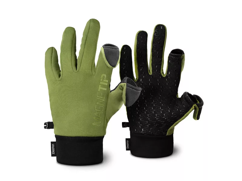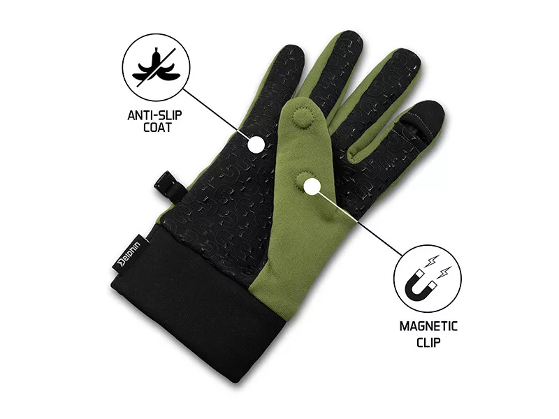 Izjemno praktične rokavice, zasnovane za ribolov v hladnejših letnih časih. Palec in kazalec imata zložljivo konico prsta. Ta zložljiva konica prsta se pritrdi z inovativnim magnetnim sistemom, všitim med dve plasti tkanine.