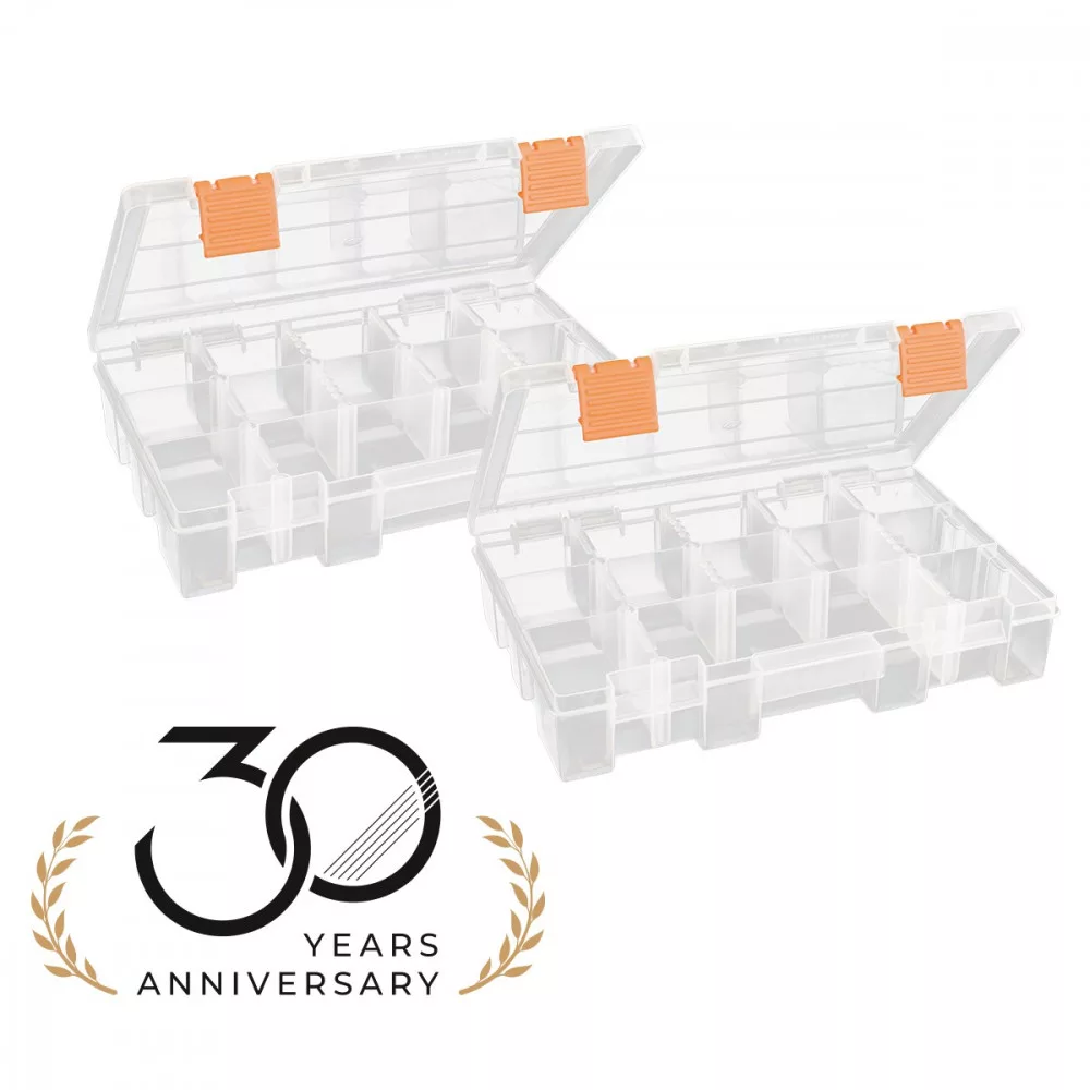 Fishing Box Organizator Duopack je škatla za umetne vabe, izdelana iz kakovostnega materiala. Sama škatla je prozorna, tako da lahko njeno vsebino vidimo tudi brez odpiranja. Zaradi patentnih zapiral se enostavno zapira in odpira. Škatla je izdelana iz prožnega, odpornega materiala s praktično zasnovo. Pregradne stene v škatli so odstranljive, tako da lahko notranjost poljubno spreminjamo in delimo. Odlična je za ribiče na predenje, v njej pa lahko udobno shranimo tudi pripomočke za druge ribolovne metode. Na škatli je 24cm merilna lestvica. Zelo lahka škatla, tehta le 320g, transportne mere pa so 27.5x18x5.5cm, zato zavzame malo prostora in je enostavna za prenašanje. V škatli so 3 predalčki za shranjevanje dimenzij 5,5x27x5,2cm, priloženih pa je 10 pregradnih ploščic, s katerimi lahko oblikujemo 1 predalček dimenzij 5,5x5,5x5,2cm.