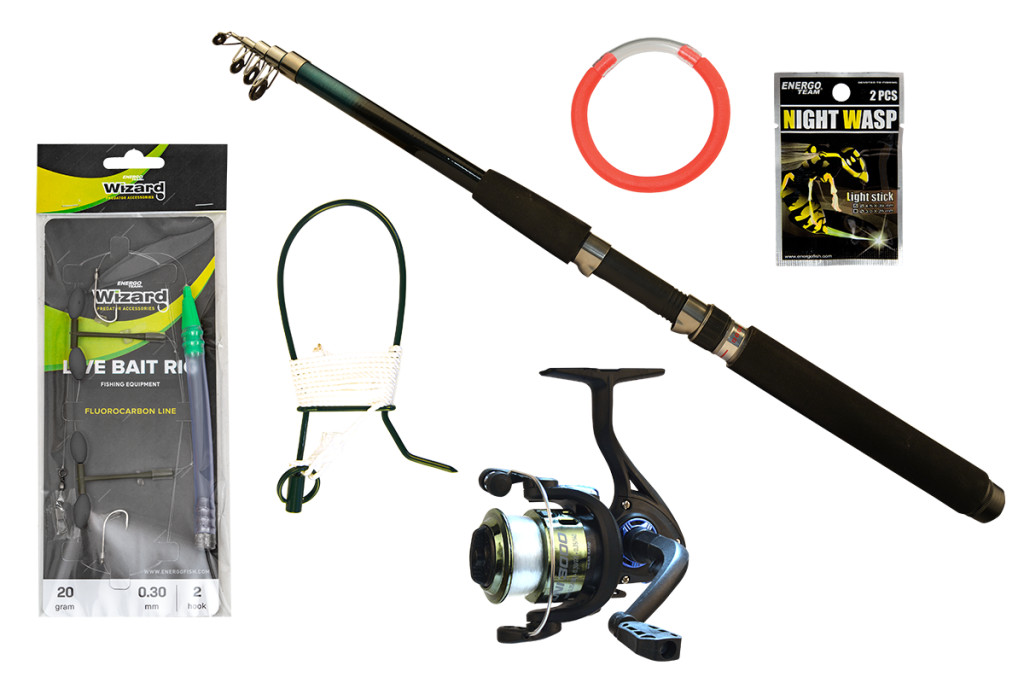 Set vključuje vse drobne predmete, ki so nepogrešljivi pri ribolovu smuča: predhodno pripravljen sistem Wizard Live Bait Rig olajša uporabo žive vabe, obroč za indikator ugriza s svetlečimi patroni pomaga pri nočnem ribolovu, medtem ko ribiška vpenjača zagotavlja varno shranjevanje ulovljenega plena. Transport celotne opreme omogoča vzdržljiva vreča za palice, ki ščiti orodje in zagotavlja udoben transport.