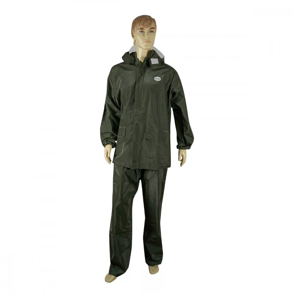 Izdelek je dvodelni (hlače + jakna) dežni plašč iz odpornega PVC materiala, ki 100% preprečuje, da bi dež pokvaril ribiški dan!