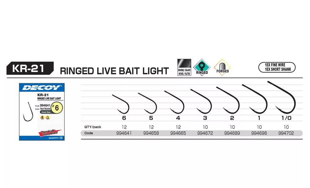 Ocene Decoy KR-21 Round Live Bait Light 2 Füles Szakállas Egyágú Ragadozóhalas Horog 12db