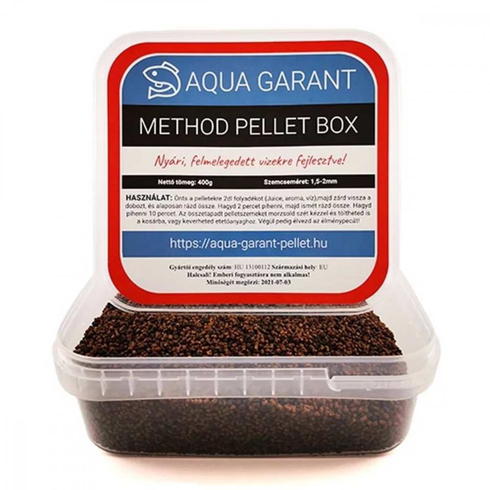 Aqua Garant method pellet box - Mešanica 4 vrst Aqua Garant peletov v določenem razmerju, z velikostjo zrnc 1,5-2mm. Razmerja smo med testnim obdobjem nenehno izboljševali, dokler končno nismo dobili mešanice, ki se maksimalno obnese v večini vod. Ob ohranjanju izjemne vsebnosti je bil primarni cilj najhitrejša možna razgradnja. Če se držiš razmerij mešanja, dobiš takšno mešanico, ki se po udarcu skorajda ne premakne v krmilno košarico približno 6 sekund.
