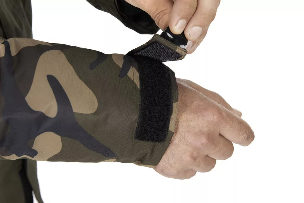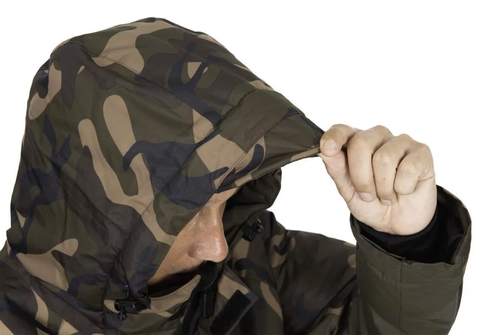 Khaki maskirni vzorec zagotavlja stilski videz, ki se popolnoma zlije z naravnim okoljem, zato je idealen tako na terenu kot ob vodi. Nastavljiva kapuca z vrvico in elastiko nudi dodatno zaščito pred dežjem, dvosmerne zadrge pa so praktične in omogočajo hitro oblačenje.
