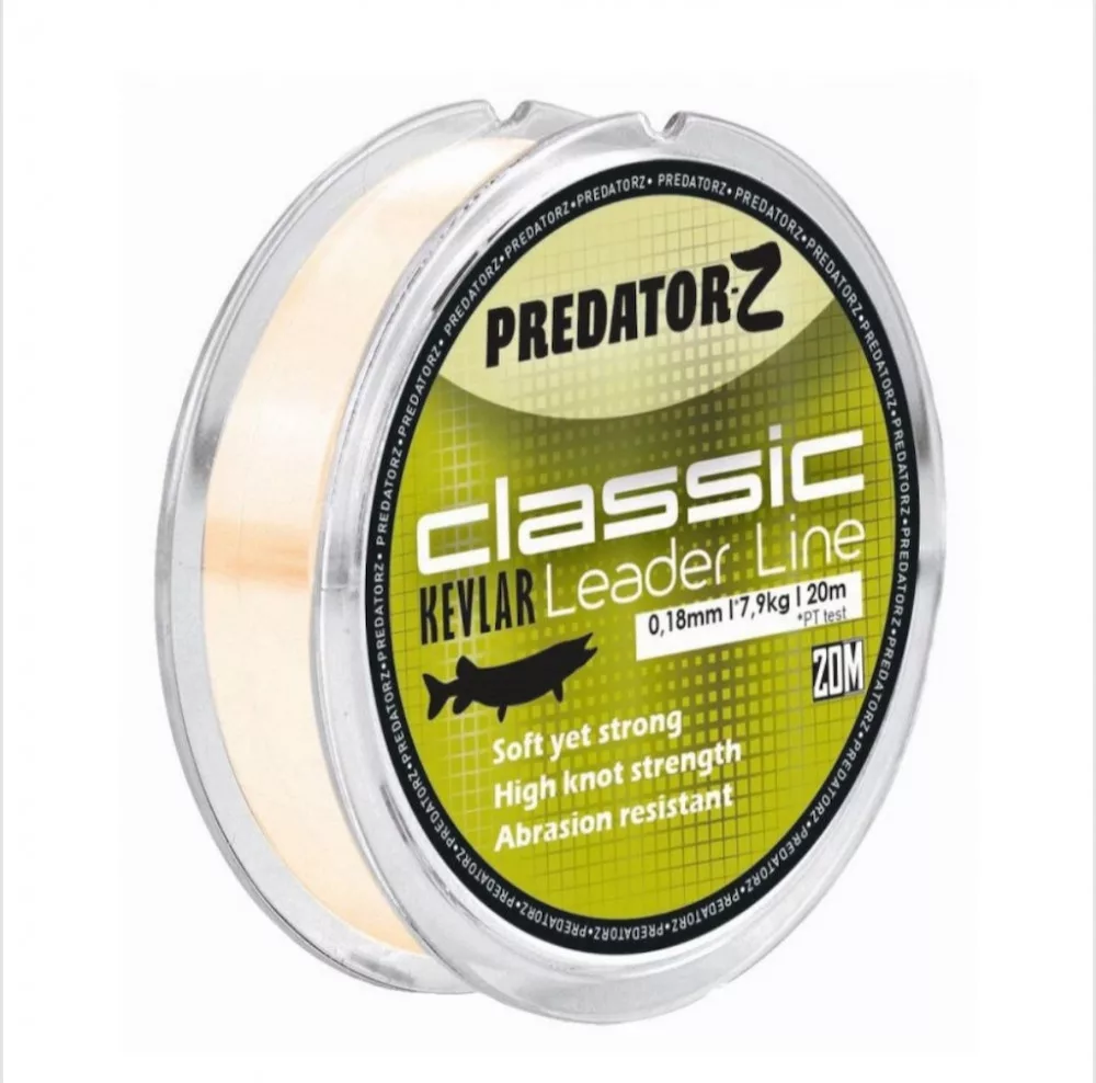 Kevlar predvezna vrvica iz kakovostnih materialov, s katero se enostavno izognemo pregrizu s strani ščuke. Je primerno mehka in hitro tone. Optimalna sposobnost prenašanja vozlov le minimalno zmanjša natezno trdnost.
