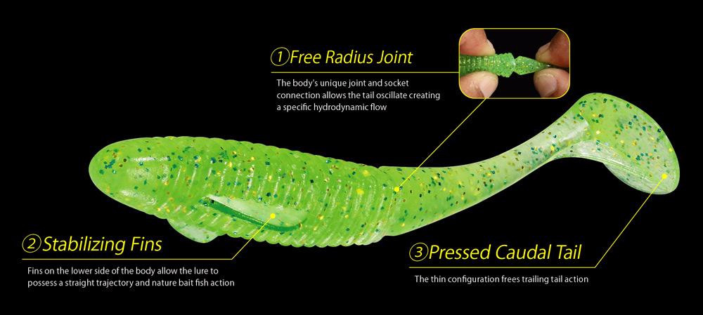 Kanali za pritrditev trnka na vrhu in dnu vabe zagotavljajo vsestransko pritrditev.