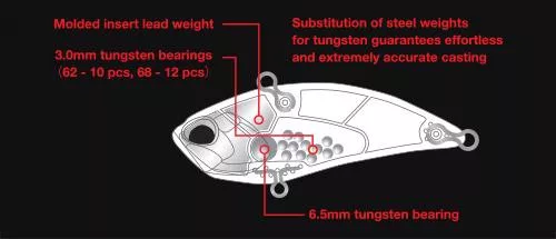 Fiksne jeklene kroglice (6,5 mm x 1) in prosto gibljive ropotajoče kroglice (3,0 mm x 12) so bile zamenjane z volframovimi kroglicami enake velikosti. Poleg tega je bila na glavo vabe dodana oblikovana fiksna utež, tako da se je skupna teža povečala za 5 g v primerjavi z običajnim modelom.
