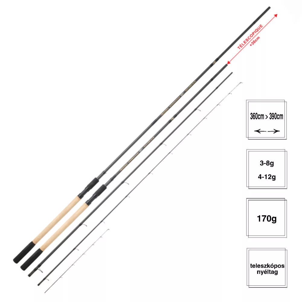 Palice Garbolino Essential X-Tend Match Hybrid 360-390cm in 390-420cm so sestavljene iz 3+1 dela. Ročajni deli so teleskopski, tako da lahko palico kadarkoli podaljšate za 30cm, kar je prava inovacija podjetja Garbolino, ki je pri drugih proizvajalcih resnično redka. Dejansko dobimo dve dolžini palice v eni. To lahko dobro izkoristimo v primeru spremenjenih vremenskih razmer ali za povečanje razdalje meta. Zelo koristno je tudi, če lovimo na določeno globino vode s fiksnim plovcem, in dodatnih 30 cm dolžine palice pomaga pri ribolovu.