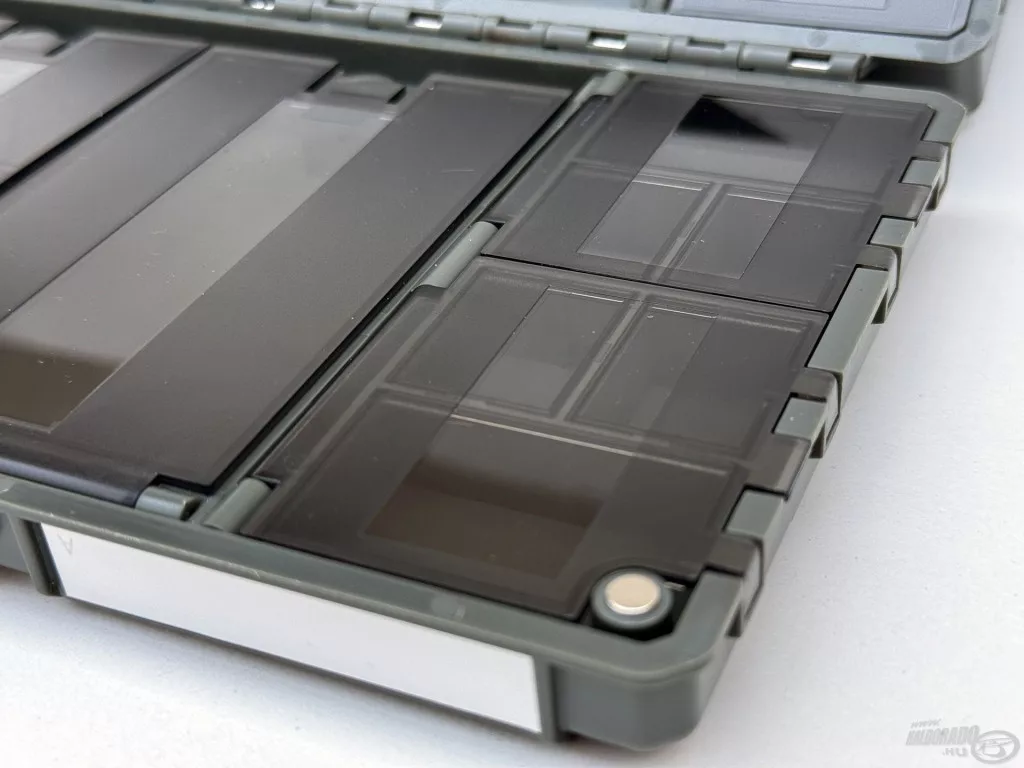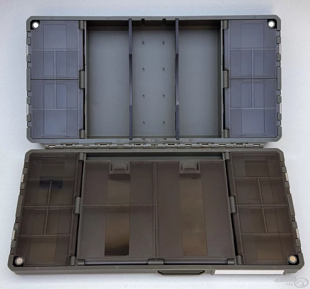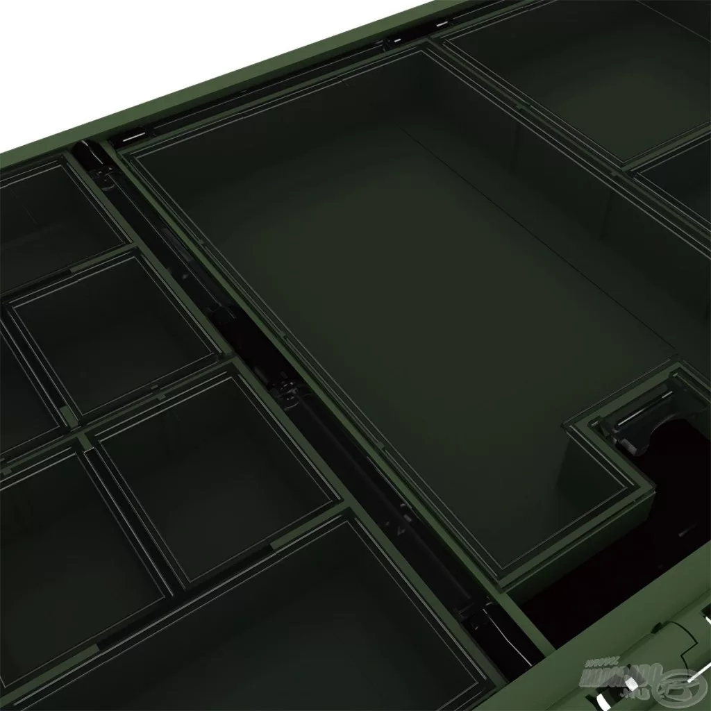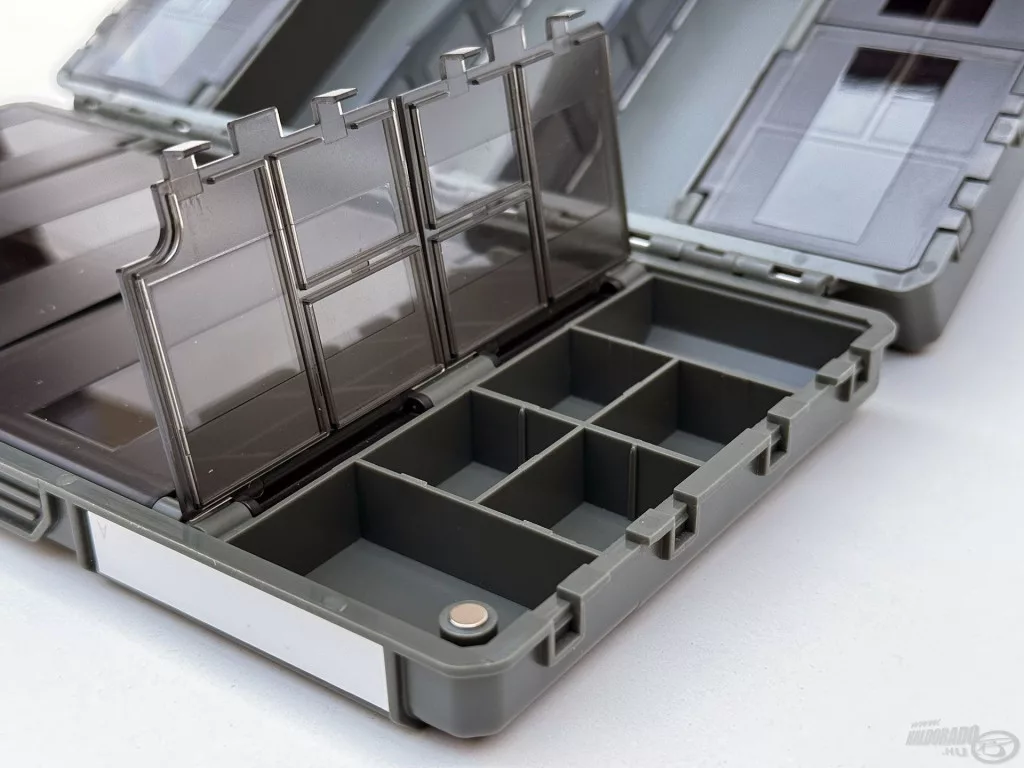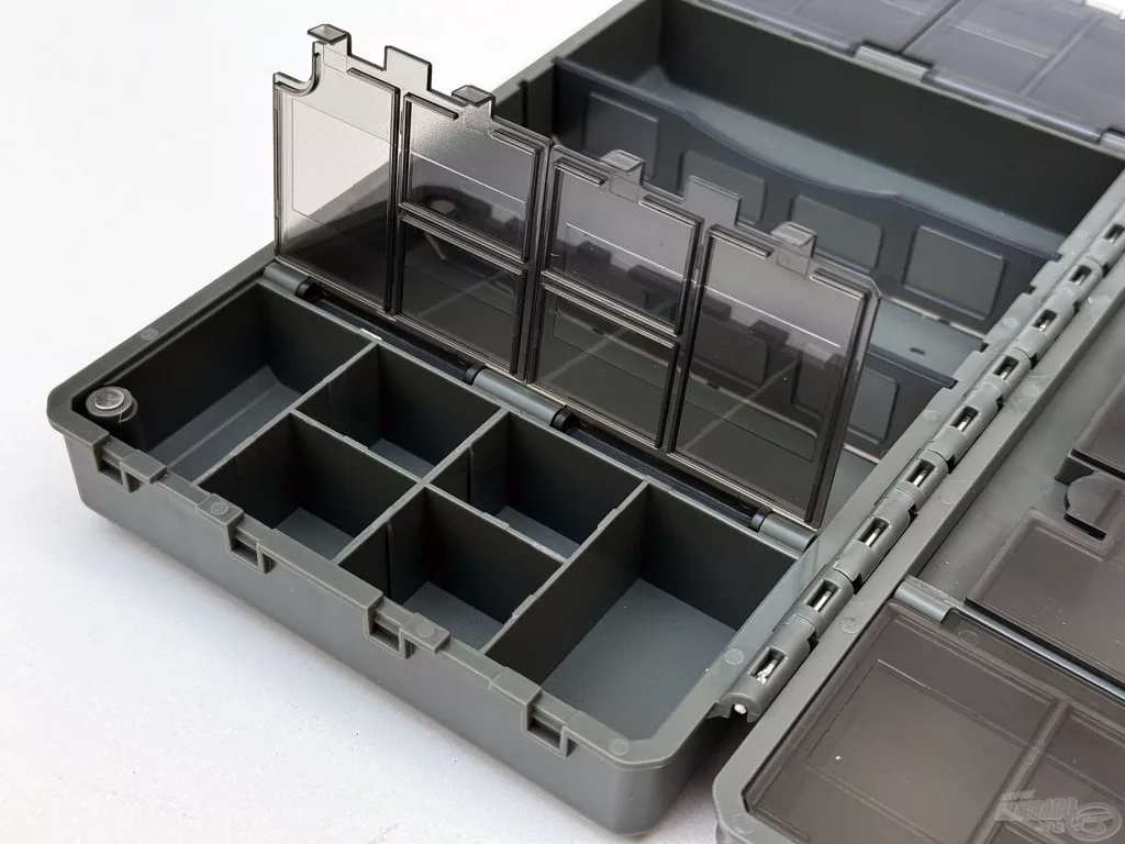 Ena polovica škatle vsebuje 27 ločenih predalov, ki se odpirajo posamično in so odlični za varno in pregledno shranjevanje manjših dodatkov – na primer vrtljivk, gumijastih pokrovčkov, obračalcev trnkov ali zamaškov. Prozorni pokrovi predalov omogočajo, da v trenutku pregledate celoten sistem, brez nepotrebnega iskanja. Druga stran služi kot večji, delno odprt prostor za shranjevanje, ki ga je mogoče po želji prilagoditi z uporabo 2 pregradnih plošč. To je idealna rešitev za shranjevanje večjih orodij, kot so svinci, koši ali manjše škatle za pribor.