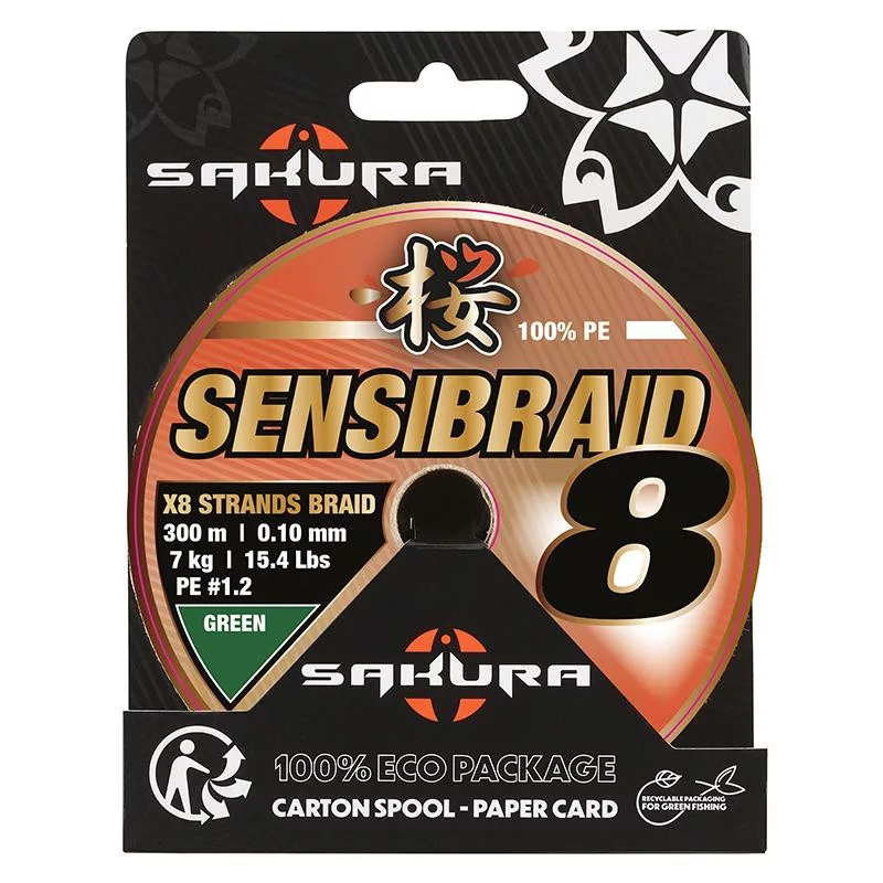 Pletene vrvice Sakura Sensibraid 8X so rezultat najnovejših tehnoloških izboljšav, izdelane iz vlaken HPE Dyneema® z visokim modulom. Izjemno tesno 8-nitna struktura zagotavlja tiho drsenje, izjemno natezno trdnost in mehkobo. Nova, okolju prijazna embalaža vključuje kolut in kartico iz 100 % recikliranega kartona.